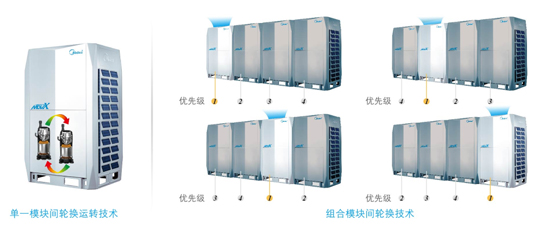 系統(tǒng)根據(jù)系統(tǒng)負(fù)荷情況,輪換設(shè)置優(yōu)先開啟的室外機模塊的壓縮機順序,平衡分配每臺室外機模塊的運行時間,大大提高了機組的可靠性和使用壽命。